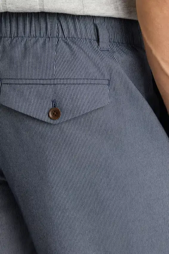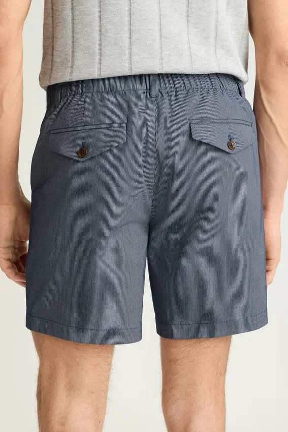 Short à devant plat avec élastique à l’arrière de la ceinture | Poches passepoilées à l’arrière avec bouton | Passants de ceinture | Rabat de poche arrière pouvant être porté à l’extérieur ou rentré