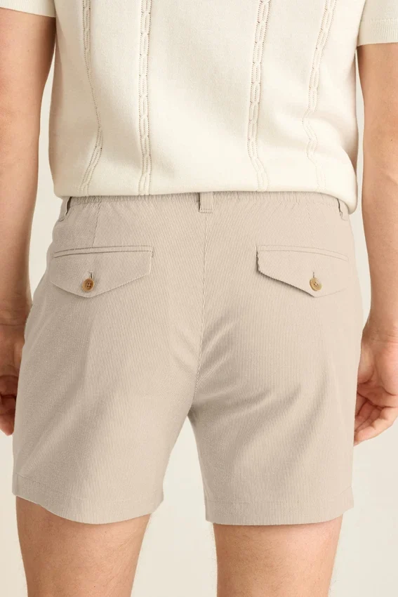 Short à devant plat avec élastique à l’arrière de la ceinture | Poches passepoilées à l’arrière avec bouton | Passants de ceinture | Rabat de poche arrière pouvant être porté à l’extérieur ou rentré