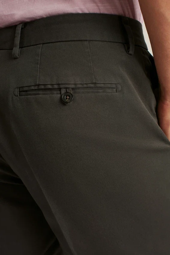 Teint en pièce pour plus de douceur | Tissu italien de luxe | Ceinture profilée signature | Fermeture avant avec patte d’extension et bouton | Poches arrière passepoilées avec boutons