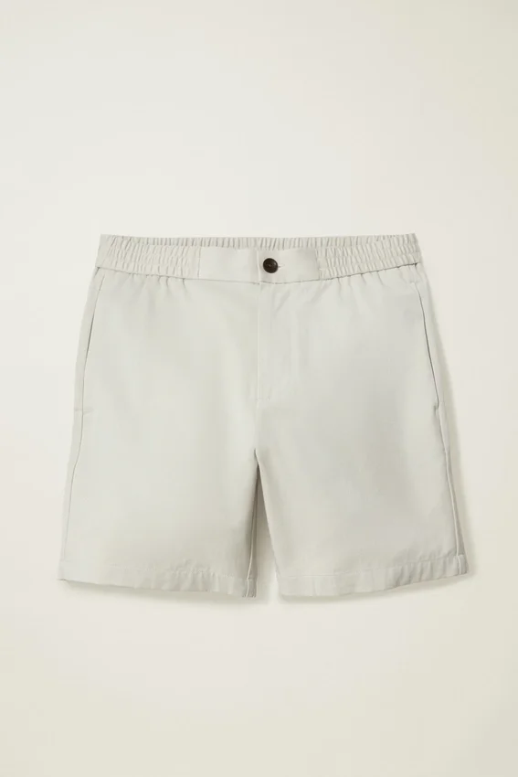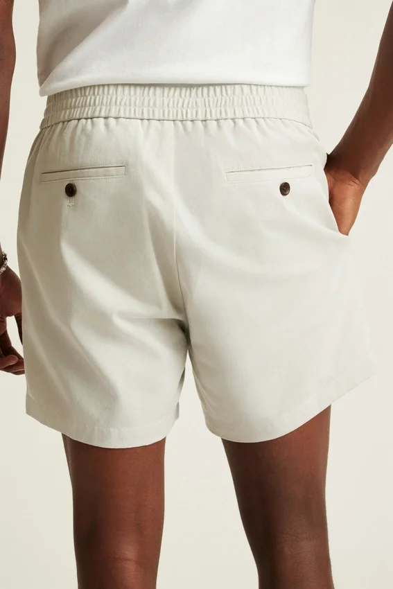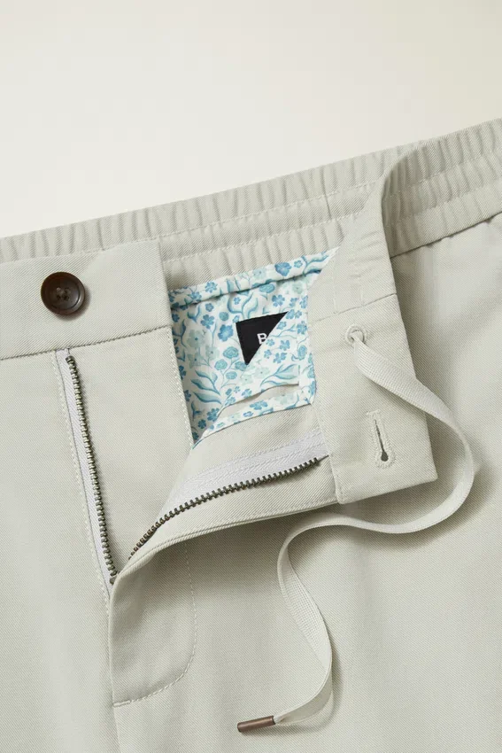 Ceinture élastique hybride | Tissu mélange Tencel + coton | Cordon de serrage plat à l’intérieur | Fermeture à boutons sur le devant | Poches passepoilées à l’arrière avec fermeture à boutons