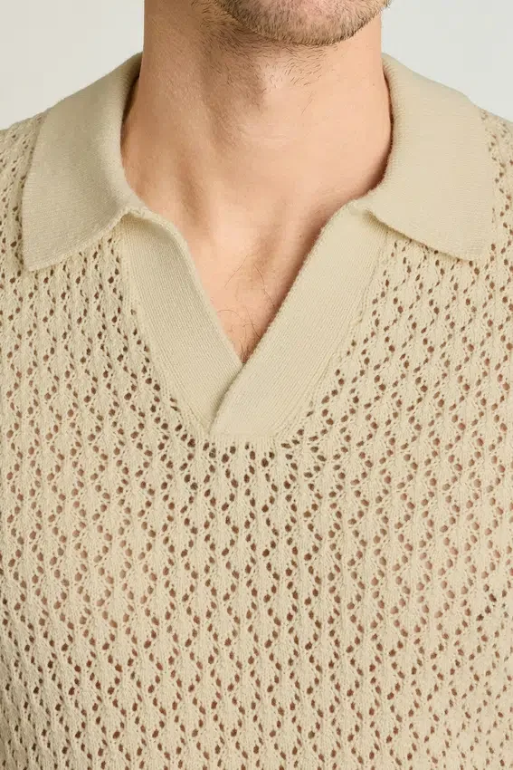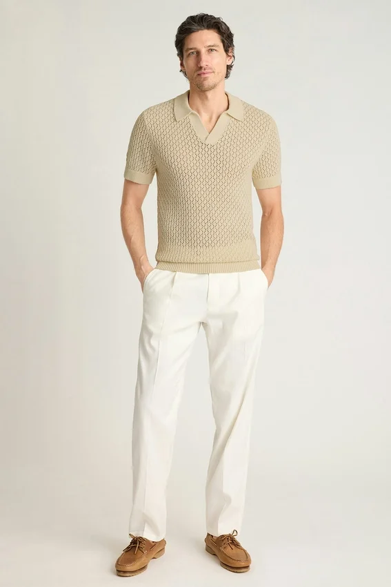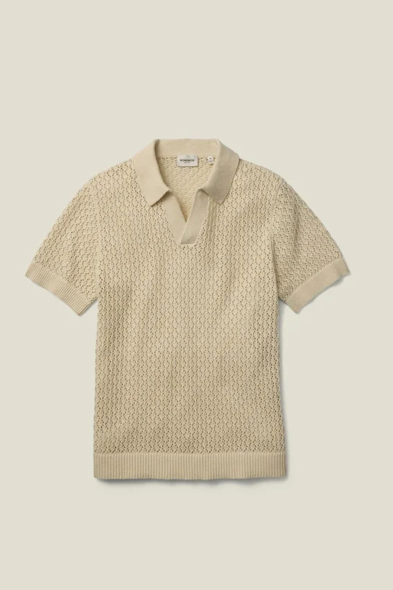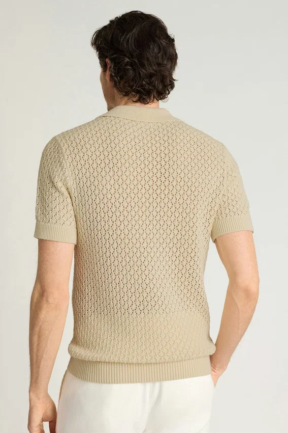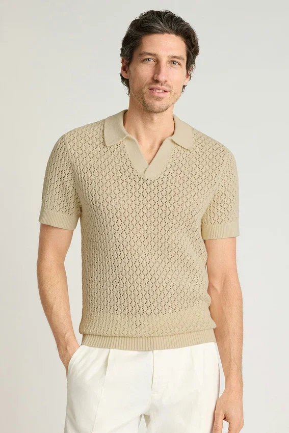 Un polo en maille au style rétro, best-seller de la marque, confectionné avec des fils de saison et des motifs originaux, prêt à s’imposer dans votre garde-robe.