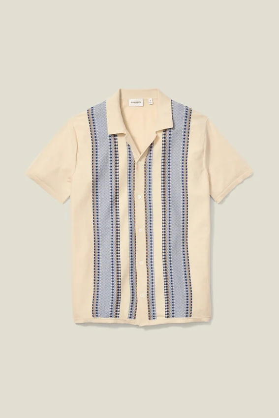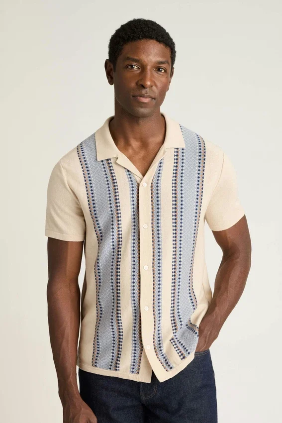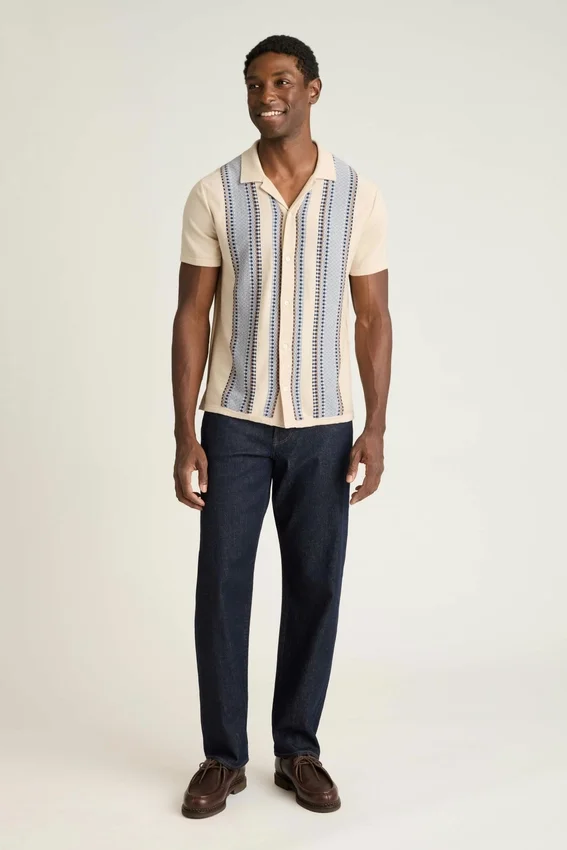 Fil de coton doux et respirant avec un motif de mailles texturées sur toute la surface pour un look rétro sophistiqué. Peut se porter fermé comme une chemise ou ouvert comme une pièce de superposition